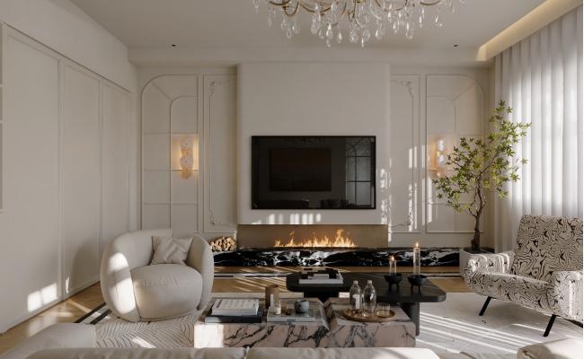 空間以珍珠白與淺金為基調(diào),精細(xì)雕花線條勾勒墻面與天花。大型水晶枝形吊燈與壁燈呼應(yīng),光線經(jīng)多處鏡面折射,倍顯璀璨。家具選用曲線柔美的天鵝絨材質(zhì),搭配洛可可式鎏金邊幾。細(xì)節(jié)處點(diǎn)綴手繪花卉與古典雕飾,整體營造浪漫典雅、輕盈奢華的法式宮廷氛圍。